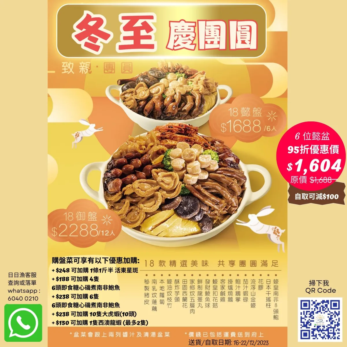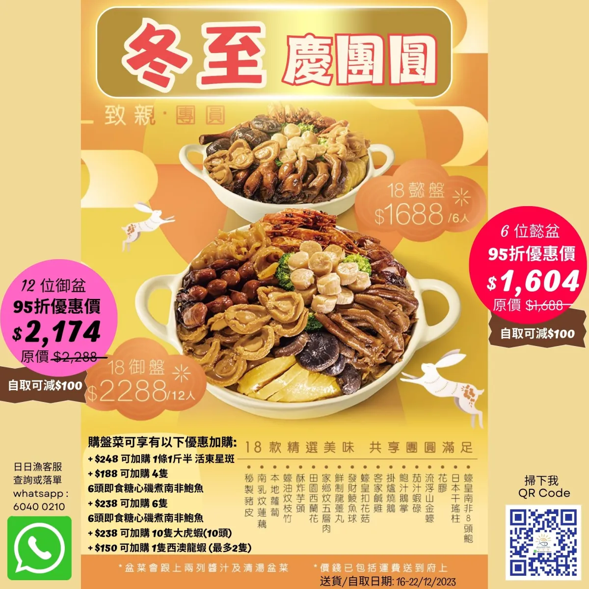 日日漁 呈獻:27/11~15/12/23 前預訂冬至盆菜~可獲 95 折優惠